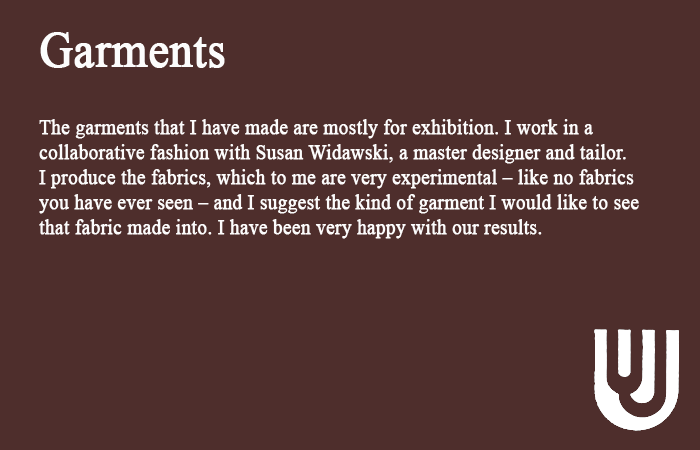The garments that I have made are mostly for exhibition. I work in a collaborative fashion with Susan Widawski, a master designer and tailor. I produce the fabrics, which to me are very experimental – like no fabrics you have ever seen – and I suggest the kind of garment I would like to see that fabric made into. I have been very happy with our results.
