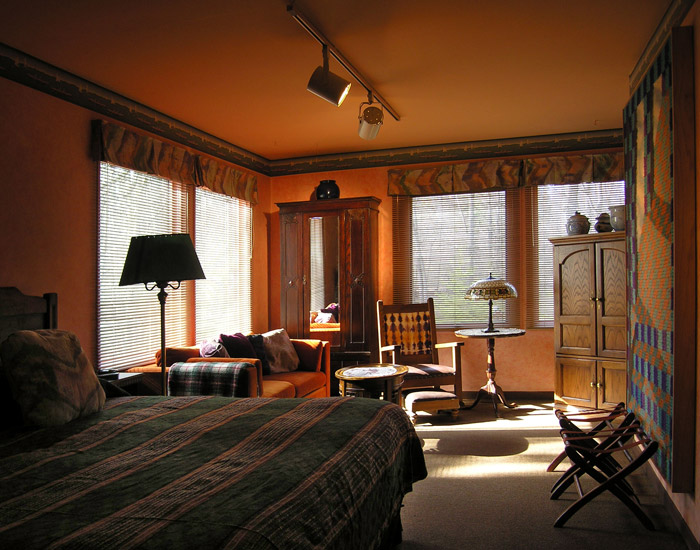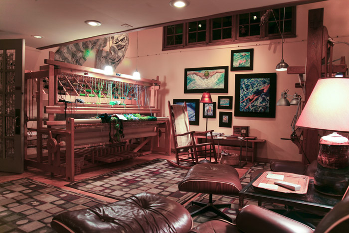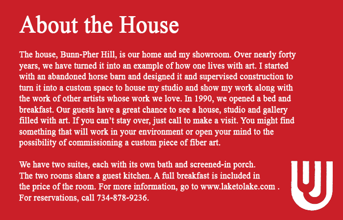 The house, Bunn-Pher Hill, is our home and my showroom. Over nearly forty years, we have turned it into an example of how one lives with art. I started with an abandoned horse barn and designed it and supervised construction to turn it into a custom space to house my studio and show my work along with the work of other artists whose work we love. In 1990, we opened a bed and breakfast. Our guests have a great chance to see a house, studio and gallery filled with art. If you can’t stay over, just call to make a visit. You might find something that will work in your environment or open your mind to the possibility of commissioning a custom piece of fiber art.