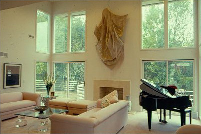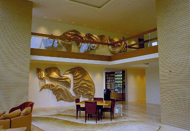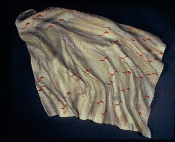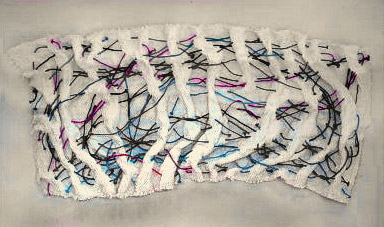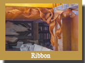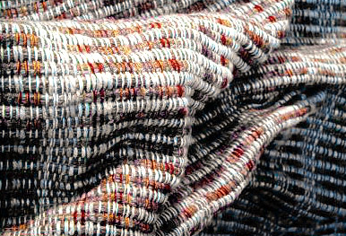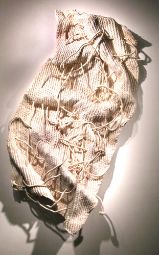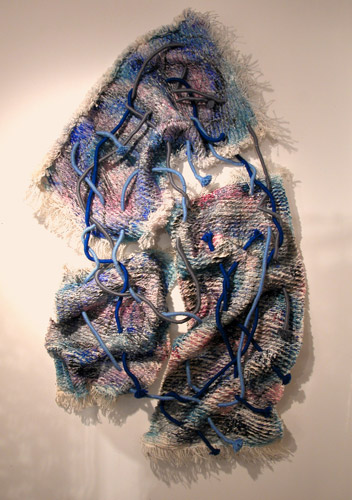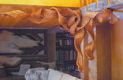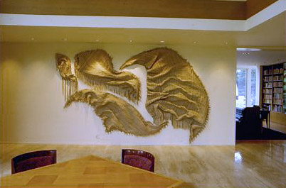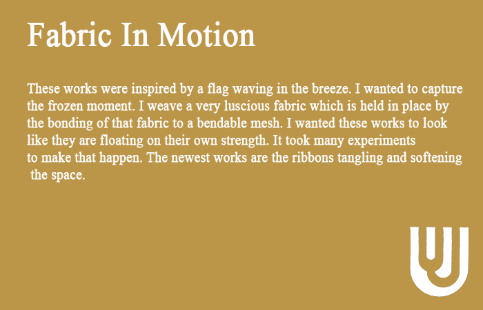 These works were inspired by a flag waving in the breeze. I wanted to capture the frozen moment. I weave a very luscious fabric which is held in place by the bonding of that fabric to a bendable mesh. I wanted these works to look like they are floating on their own strength. It took many experiments to make that happen. The newest works are the ribbons tangling and softening the space.