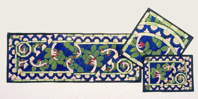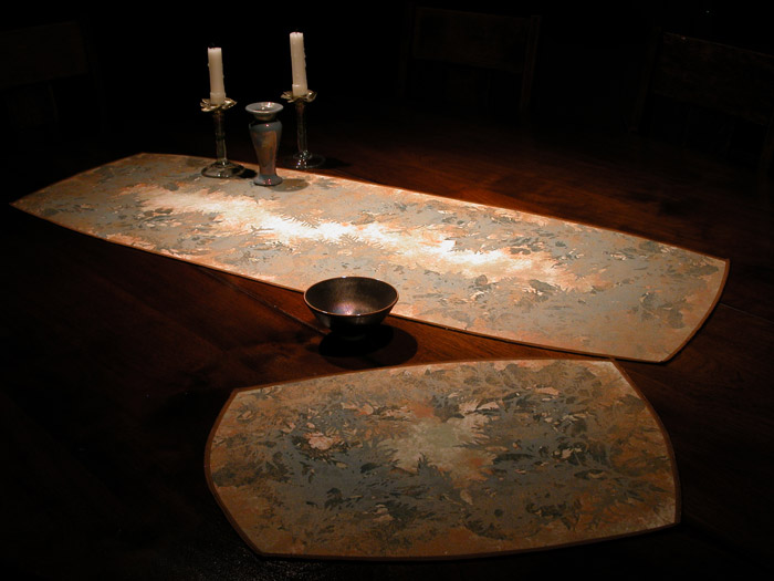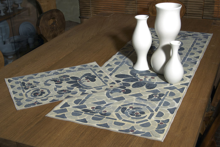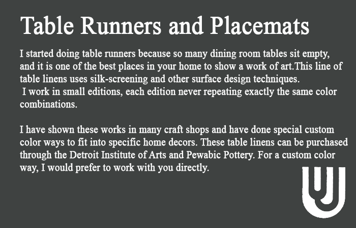 I have shown these works in many craft shops and have done special custom color ways to fit into specific home decors. These table linens can be purchased through the Detroit Institute of Arts and Pewabic Pottery. For a custom color way, I would prefer to work with you directly.